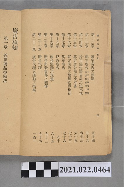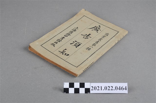 本物件為平湖甘永龍編譯《廣告須知》,為膠裝書。封面印有「商業叢書第一種」、「廣告須知」、「上海商務印書館出版」等字樣,書側印有「廣告須知」、「上海商務書館印行」字樣,書背印有「商務印書館」商標。本書目次共分為二十二章,內容包含圖畫廣告之價值、雜誌與新聞紙、戶外廣告、街車廣告等。末頁為版權頁,寫有「商業印書館發行」、「此書有著作權翻印必究」等內容。
