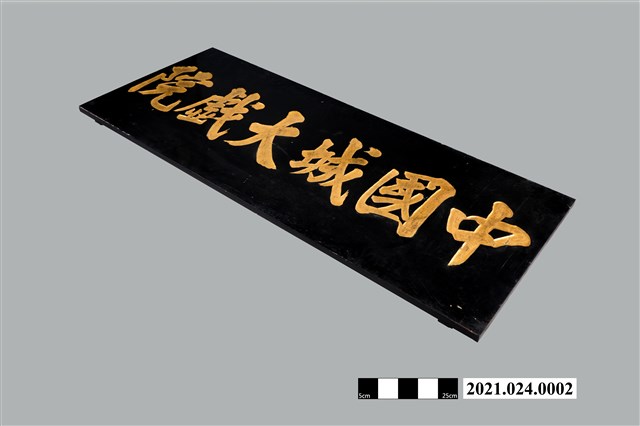 本物件為中國城大戲院牌匾,底為黑色,上為陰刻金色字樣,由右至左有「中國城大戱院」字樣,為中國城戲院正門入口處牌匾。中國城戲院由翁宗崑經營,為臺南中國城後棟(靠近運河面)3至4樓,是當時市民重要的聚會場所。2016年1月採集時,該牌匾卸下斜置於1樓售票辦公室。