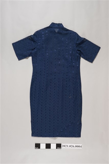 2. 本件為寶藍色蕾絲繡花五分袖夏旗袍與內襯衣組,共1組2件。旗袍以質料輕薄之寶藍色蕾絲繡花紗布製成,蕾絲繡花圖案為圓葉片與小花。具小立領,自領口開右衽斜下至脇邊,以金屬釘釦開合固定,五分袖,軀幹寬鬆,腰身不明顯,裙長約至穿著者之膝下至小腿上,下擺略內收,為夏季服飾。由於外層即為薄透,內需搭配一件式長背心裙為襯裡,以外部同色之寶藍色絲質布製作,手縫痕跡明顯,裙襬一側還有一小塊黑棉布補丁。