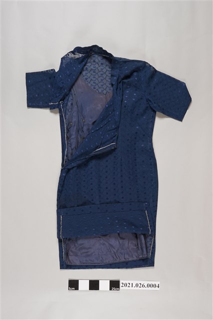 1. 本件為姚克英女士自製服飾,約民國50-60年代製作與穿著(約40-60歲左右),製作方式為自行購買布料,打版裁切後,再以縫紉機縫合長邊與緄邊,鈕扣、領子、脇邊開叉、裙擺、袖口等處,部分以手工縫製與修改。