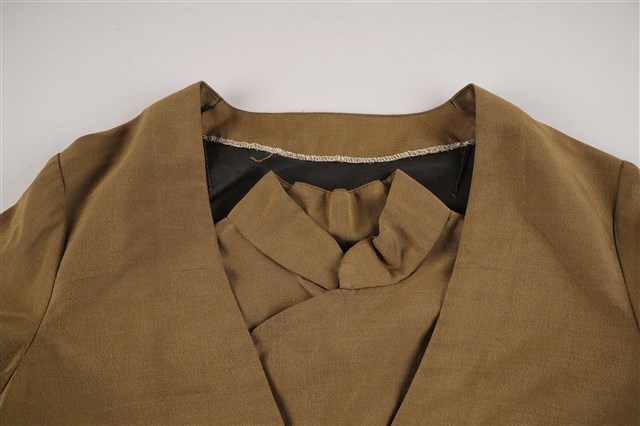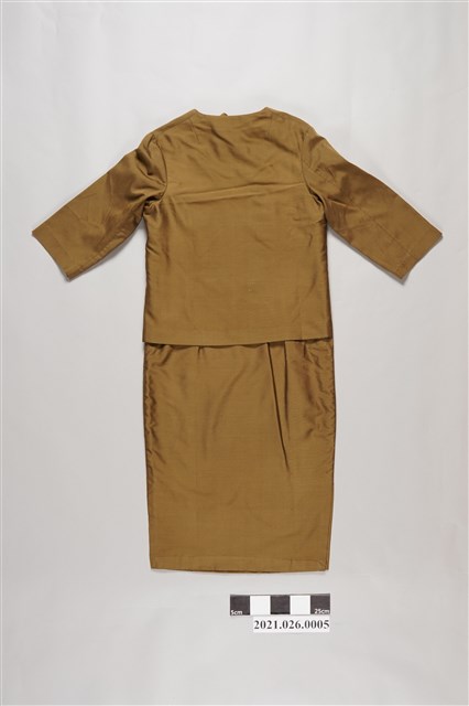 1. 本件為姚克英女士自製服飾,約民國50-60年代製作與穿著(約40-60歲左右),製作方式為自行購買布料,打版裁切後,再以縫紉機縫合長邊與緄邊,鈕扣、領子、脇邊開叉、裙擺、袖口等處,部分以手工縫製與修改。