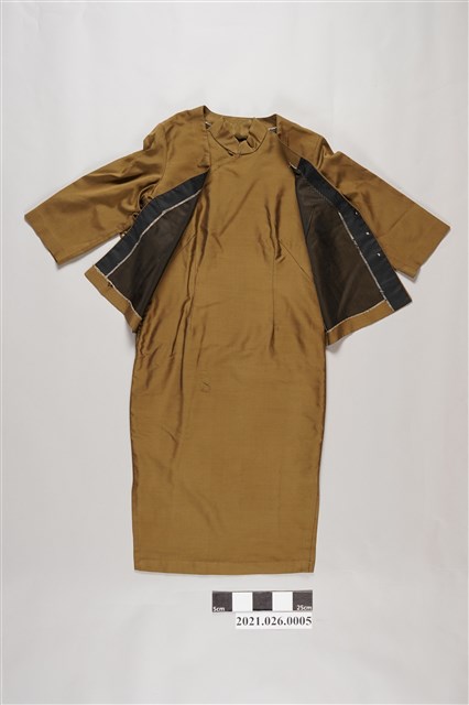 2. 本件為橄欖綠棉立領兩件式長袖旗袍,共1組2件,包括旗袍與小外套。全件以棉質斜紋織布製成,外側為橄欖綠色,內側為黑色。具小立領,自領口開右衽斜下至脇邊,以金屬釘釦開合固定,短袖,軀幹寬鬆,腰身不明顯,裙長約至穿著者之膝下至小腿上,下擺略內收。本件上半身多做一件大V領的對襟長袖短外套,天冷時可另外附加於旗袍之外,開襟附有三個圓型布釦,內外兩件同材質布料具有整裡感,推測為秋季穿著。