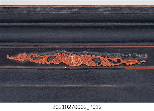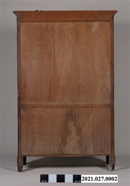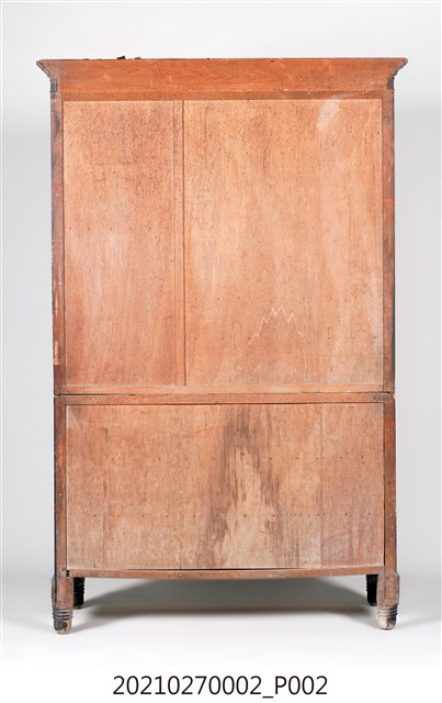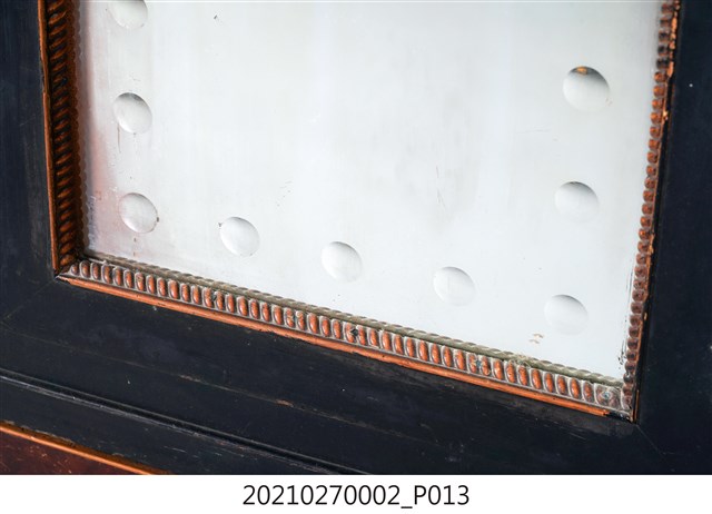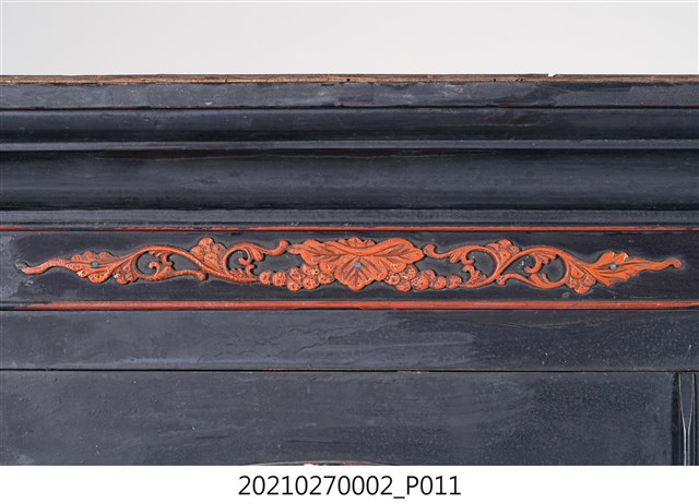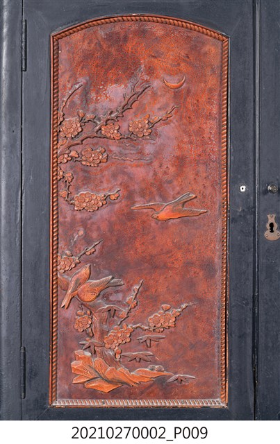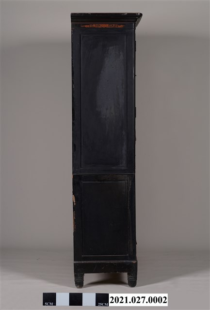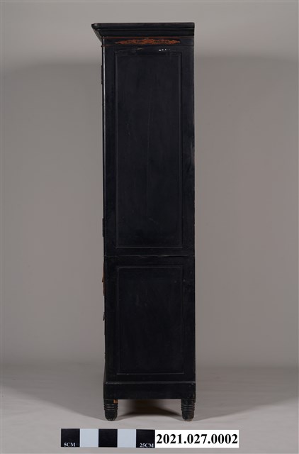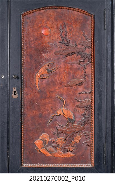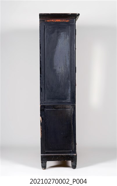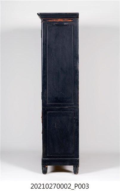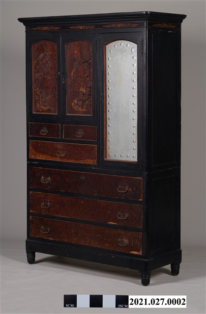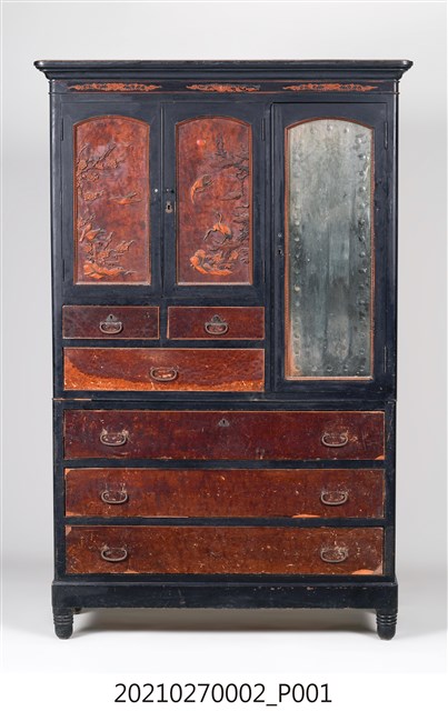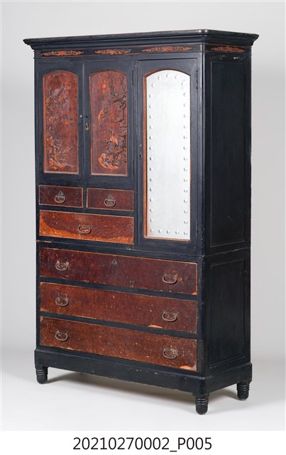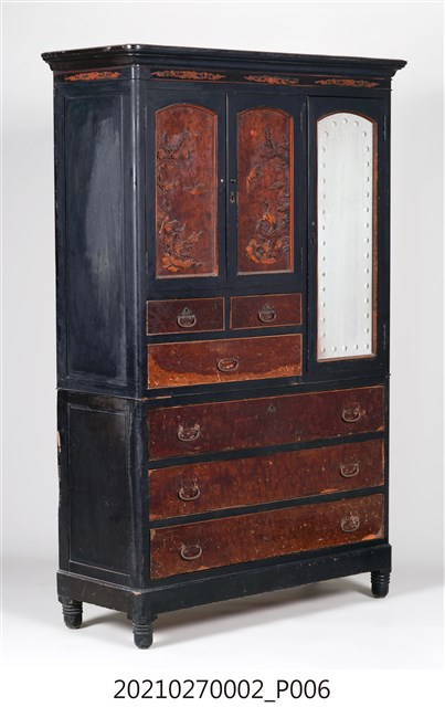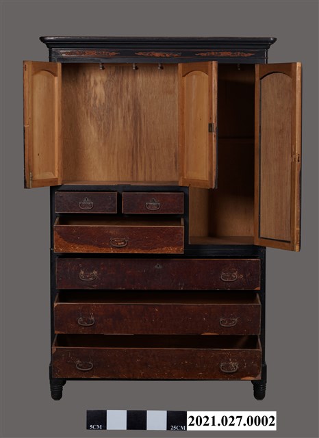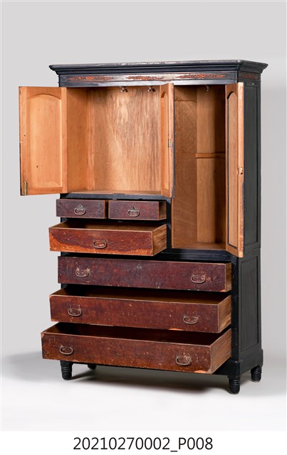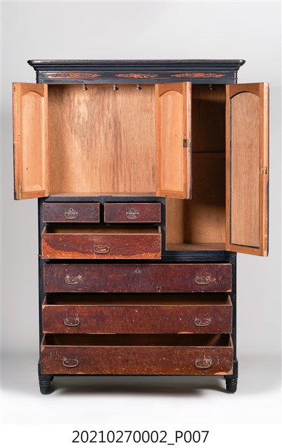 2. 木製高櫥櫃,黑漆間紅褐色漆,衣櫃分上下櫃兩個部分,上櫃頂部採巴洛克式建築頂簷,間飾西洋捲葉花草貼木。櫃子右側為半身照鏡,門板拉開內側可吊掛外套長衣,左側上半為左右對開門板,門板上以異木鑲嵌「喜上眉梢」(夜景)、「松鶴遐齡」(日景)吉祥圖案之貼木裝飾,右門扇附有葫蘆形鎖孔與拉鈕,門板拉開內部為放置和服的4層淺木托盤;左側下方為2只小抽屜與1只中型抽屜,抽屜面板中央附有金屬拉環與靈芝形鎖孔與鑰匙。下櫃則是三層大型抽屜,可收納各種衣物,抽屜面板左右兩側附有金屬拉環方便抽屜開闔。櫃底四角各帶有一只車枳矮腳,略將櫃體架高。
