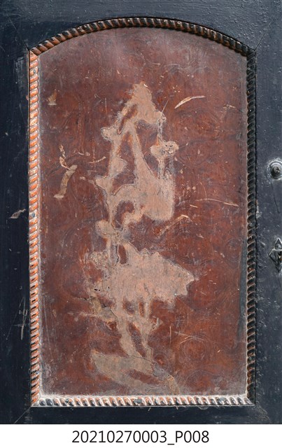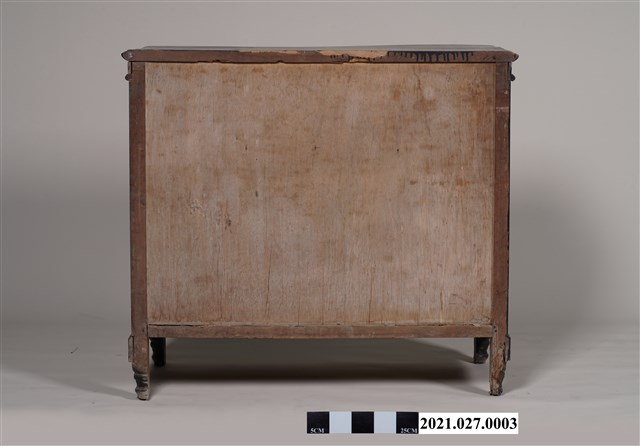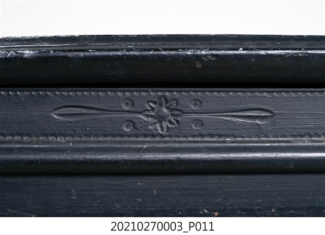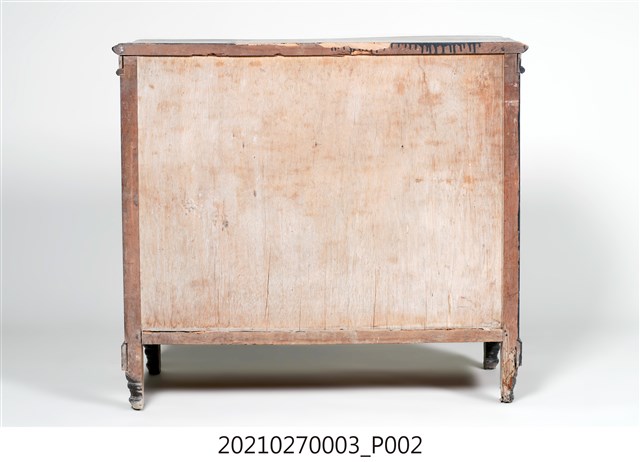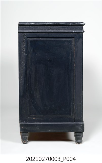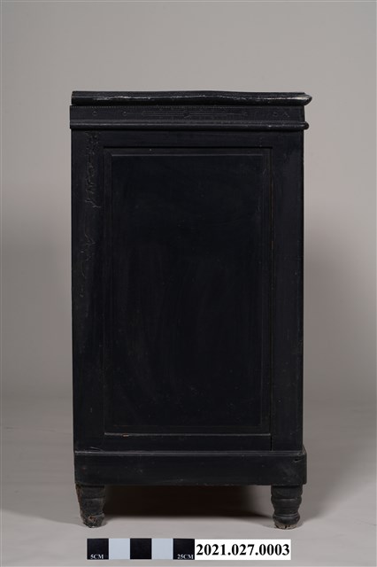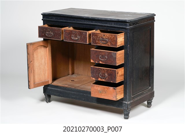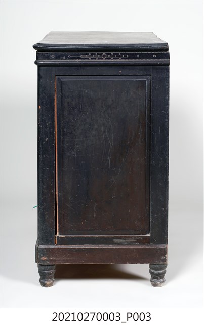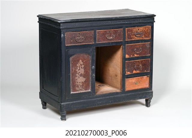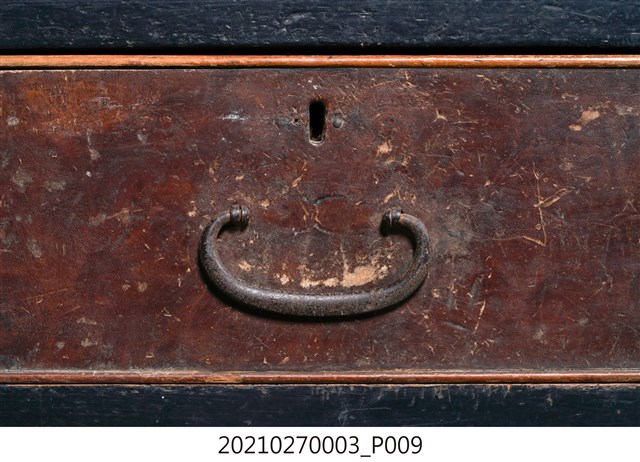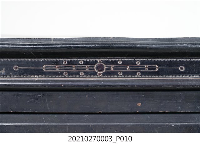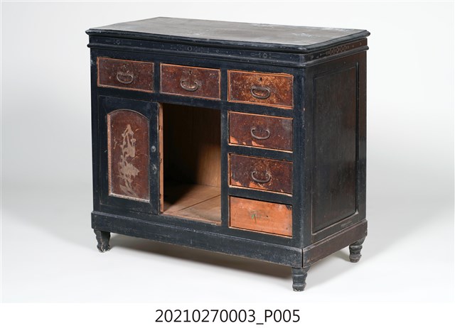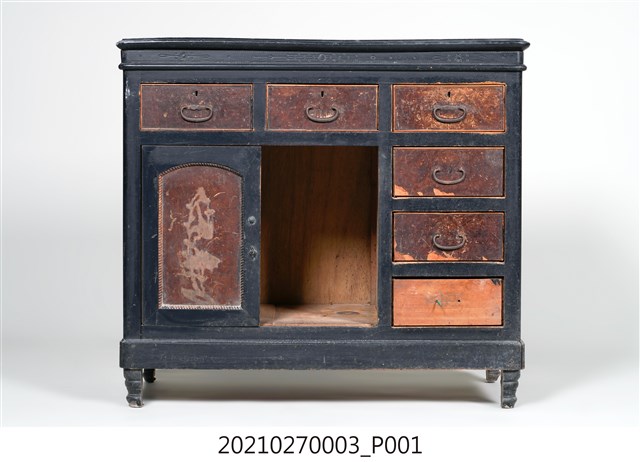 2. 長方形桌櫃,形制風格十分簡樸,黑漆間紅褐色漆素面無紋,僅於桌面下緣略施幾何花紋雕刻。櫃子上層具有3個大小相同的抽屜,抽屜屜面皆膨堵帶半橢圓形金屬拉環,半圓形拉環上方皆加開一鎖孔。下層左側為左右對開的拉門,可放置大型物件,但右側門扇已脫落,從左側拉門表面深色漬痕判斷,門上原先應有貼木裝飾,但皆已脫落。櫃子下層右側為3層大小相同的小抽屜,抽屜屜面亦膨堵帶半橢圓形金屬拉把,最底層之抽屜面板表面已剝落,露出內層木板,屜環亦遺失。櫃底四角各帶有一只車枳矮腳,略將櫃體架高。