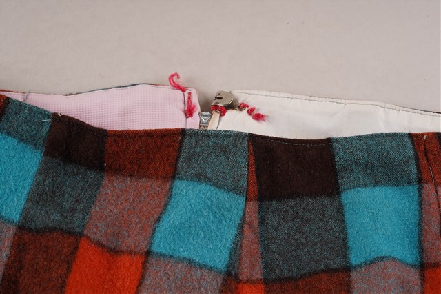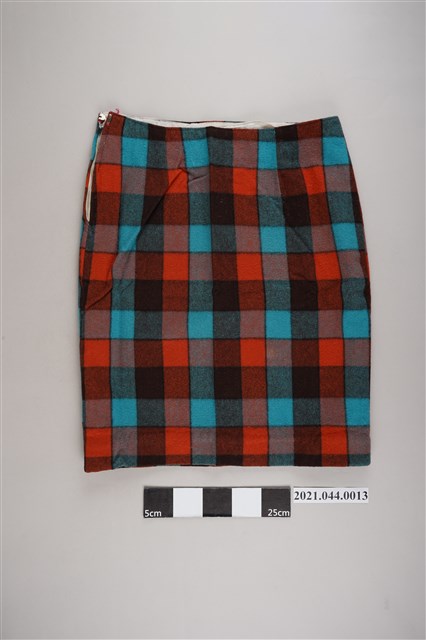 本件為捐贈者母親廖甜女士自製的冬季短裙,約30-40歲左右穿著,以藍紅黑格紋布及紉機縫製而成,裙長約膝上,腰側邊開口附拉鍊,裙襬略向內收窄。