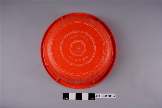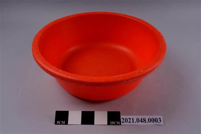 紅色塑膠和面盆,圓形、外敞開口,內底深,平底。主要用來製作水餃皮和餛飩皮,將麵粉與水混合均勻。