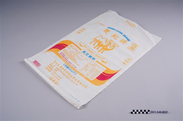 1. 本件為沈家製麵店中所使用的麵粉品牌之一,雙駝牌高筋麵粉之麵粉外包裝袋,22公斤裝塑膠麻布袋,底色為白色,正面中央印有橙黃色2隻雙峰駱駝之商標圖案與其他製造標示文字。