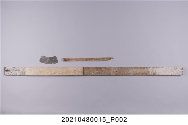 本件為沈父自行製作之餛飩皮切割工具,共1組3件,包括長木板尺、竹製短尺、彎弧片狀不鏽鋼刀。使用時必須戴棉手套,將薄麵帶放置在長尺下方,切割出適當長度後,再用短尺切出適當寬度,正方形的餛飩皮就製作完成。
