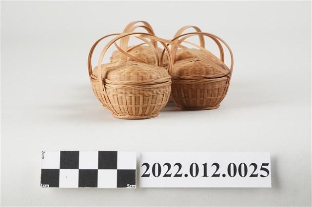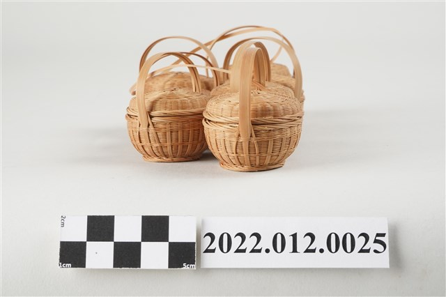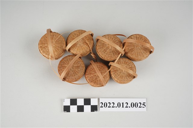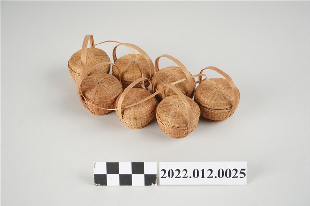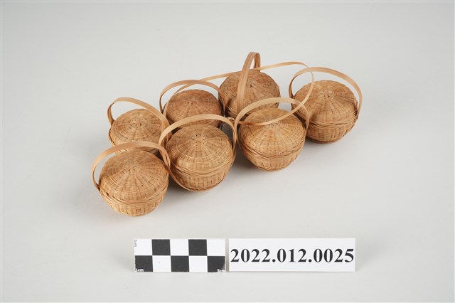 1. 本物件為劉靜枝所製作之小竹籃一串,共有7個小竹籃由1條細竹條繫在一起,竹籃大小一致,可分為竹籃及竹籃蓋兩個部份,竹籃蓋以米字編技法編製,竹籃也由米字編編製而成,竹籃蓋可掀開,有厚竹片製成的提把。