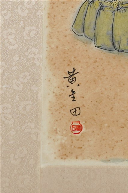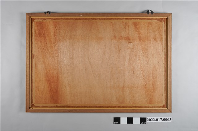 為黃金田繪《風鼓車》,為方形,外層有木質裱框,畫面中為1處農村風景,位於戶外空曠地,中央可見1臺正在運轉之風鼓車,有2人在操作,另外有4人在收集鋪曬於地上之穀粒,左側另有已包裝成袋者,被人拿去左上之穀倉存放,左下有「黃金田」黑色字樣與紅色蓋印。黃金田,生於昭和3年(1928)的南投水里,為陶藝家、歌仔戲佈景繪師、民俗畫繪者等,擅長以繪畫方式記錄鄉村市井小民的生活點滴。