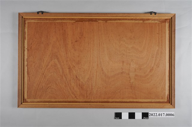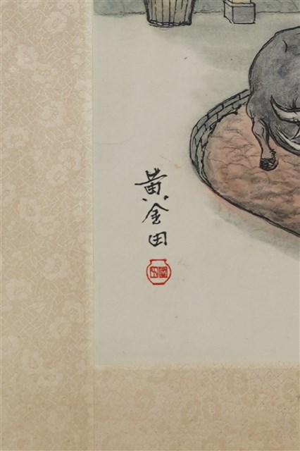 為黃金田繪,無主題,內容據研判為牛隻研磨陶土。圖繪為方形,外層有木質裱框,畫面中可見有1圓形凹地,內鋪滿褐色,1人站於圓心驅使2頭牛在凹地內繞圓行走,於凹地外,更有1人以鏟子翻攪褐色物體,該場所有擋雨棚,戶外可見非常多陶甕,左下有「黃金田」黑色字樣與紅色蓋印。黃金田,生於昭和3年(1928)的南投水里,為陶藝家、歌仔戲佈景繪師、民俗畫繪者等,擅長以繪畫方式記錄鄉村市井小民的生活點滴。