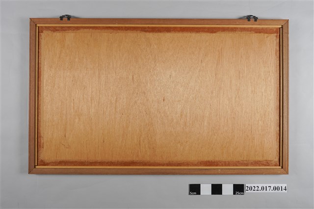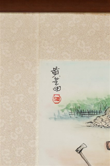 為黃金田繪《蛇窯》,為方形,外層有木質裱框,畫面為蛇窯工作場景,較近處可見有3人,其中1人正在劈材,另外1人將未劈之木棍放入蛇窯中,另外1人則在蛇窯上排列木材,較遠處可見有人在排列陶甕,左上有「黃金田」黑色字樣與紅色蓋印。黃金田,生於昭和3年(1928)的南投水里,為陶藝家、歌仔戲佈景繪師、民俗畫繪者等,擅長以繪畫方式記錄鄉村市井小民的生活點滴。