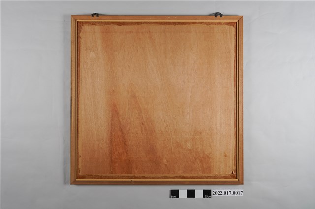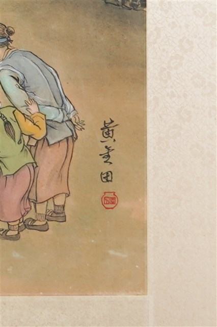 為黃金田繪《豬隻交易》,為方形,外層有木質裱框,畫面為豬隻交易場景,成為交易品之黑豬四腳遭綑綁,並將其倒掛扛起,可見共有5隻豬已被綑綁,其中1隻已被掛起,共有3名男子,1名女子,2名孩童與1名老婦,畫面遠處可見雞鴨自由奔走,右下有「黃金田」黑色字樣與紅色蓋印。黃金田,生於昭和3年(1928)的南投水里,為陶藝家、歌仔戲佈景繪師、民俗畫繪者等,擅長以繪畫方式記錄鄉村市井小民的生活點滴。