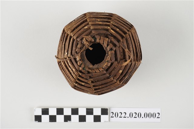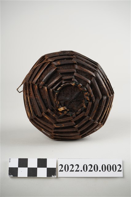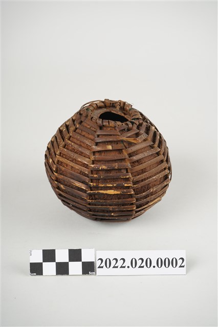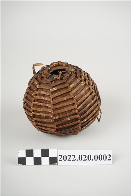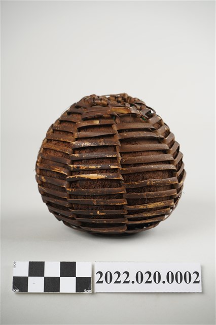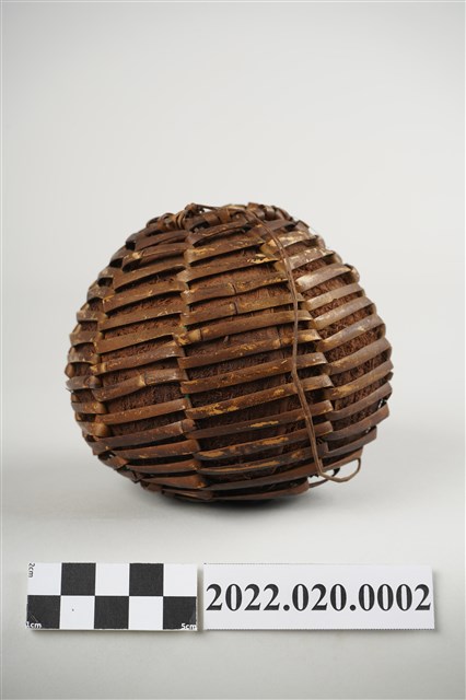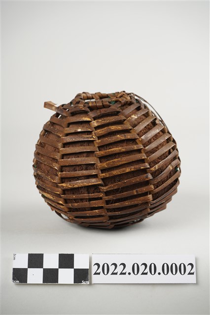 1. 本件為雅美/達悟族椰殼水壺,水壺器身以完整去除內層和外皮的椰殼為容器,上方開一小口,椰殼外層綁縛藤編提袋,壺口附近有細麻繩之提繩,但已斷裂。