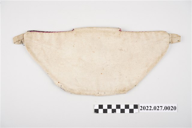南部地區原住民,如排灣、魯凱、西拉雅、馬卡道、大武壠或斯卡羅等族,偏好使用棉布製成的半橢圓形或船形繡花佩袋,盛裝檳榔和菸草等隨身物品。本件為船形布袋,袋身以白色布料為底,袋身繡有排列的黑色花葉紋,紫色繡線點綴其間。從繡紋圖樣推測,應為南部平原地區西拉雅人或馬卡道人使用之物。