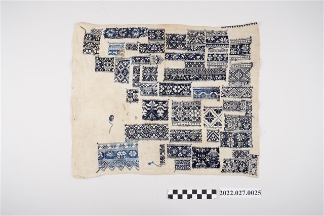 本件以白色布料為底,用藍色細線繡出40組紋樣圖形。圖案多樣,包含鳥紋、幾何花葉紋、圓形花葉紋、人形紋、動物紋、山形紋、直線紋等組合,推測為十字繡繡紋樣本。從繡紋圖樣推測,應為南部平原地區西拉雅人或馬卡道人使用之物。