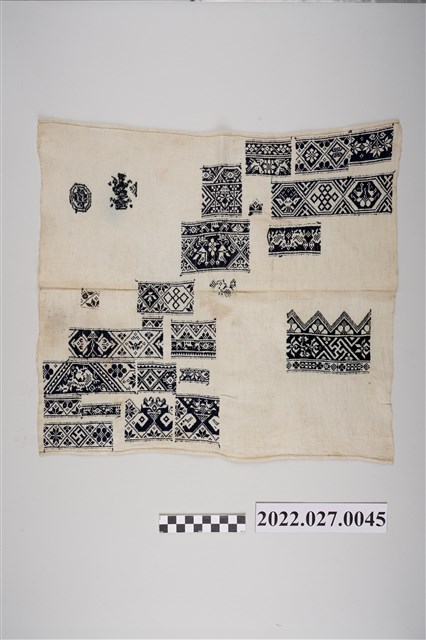 本件以正方形白色布料為底,已深藍色細線繡出25組紋樣圖形。圖案多樣,包含鳥紋、幾何花葉紋、圓形花葉紋、人形紋、龍紋、麒麟紋、山形紋等,應為十字繡繡紋樣本。從繡紋圖樣推測,為南部平原地區西拉雅人使用之物。