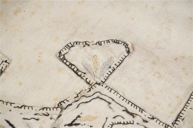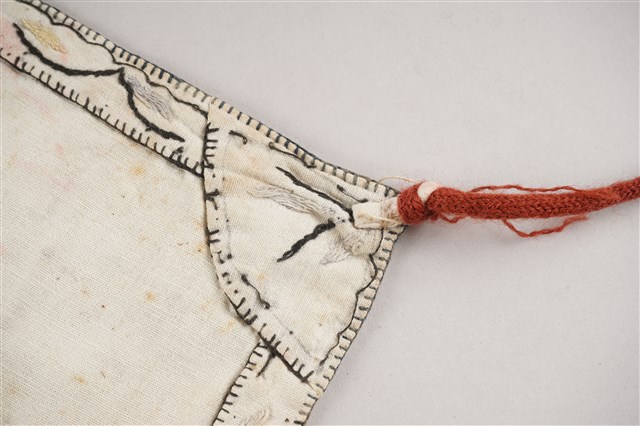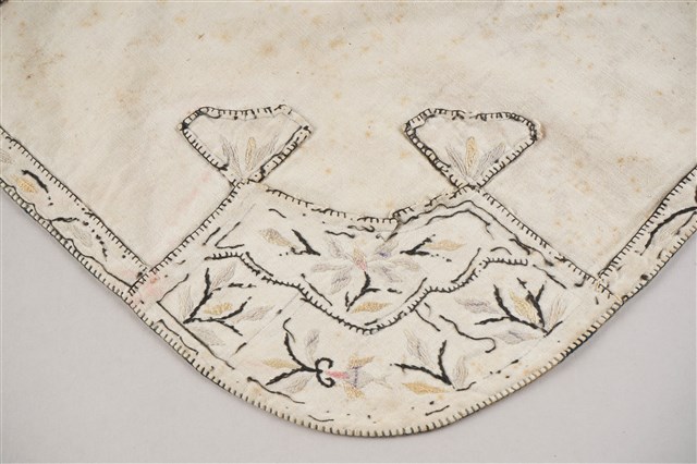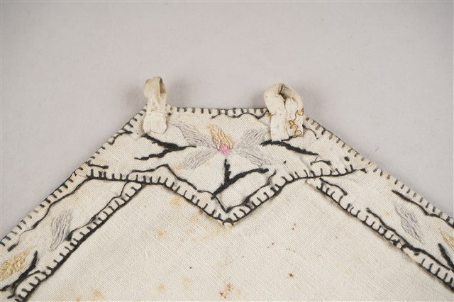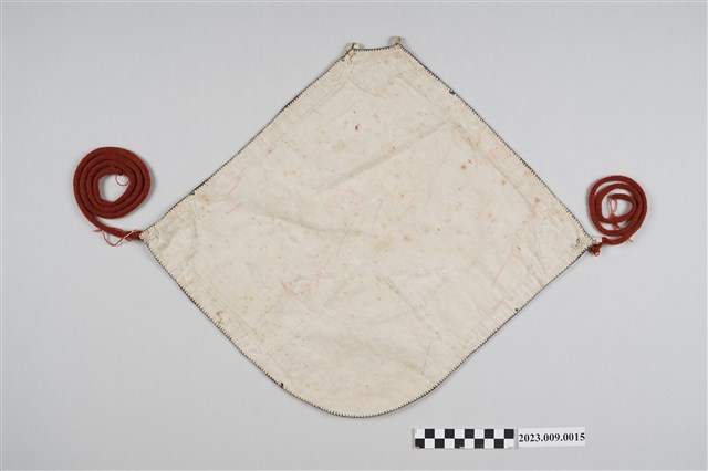 本物件為米白底彩繡梅花紋菱形肚兜,為菱形之肚兜,圍頸部分裁平,正反面為米白色布,正面可見鎖邊繡、套針縫、及緞面繡之技法。四面緄邊為梳齒紋及梅花、梅枝紋,圍腹之口袋蓋片亦繡有梅花與梅枝,部分鎖邊已有脫落痕跡。梅花雖經嚴寒而不凋,於傳統中寓意高風亮節的精神。