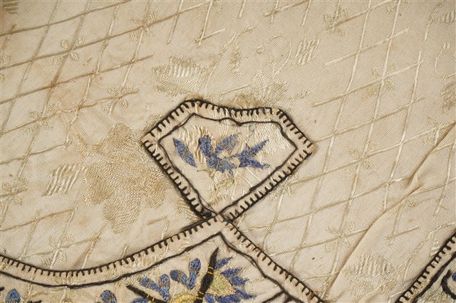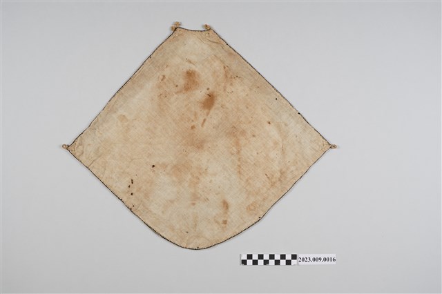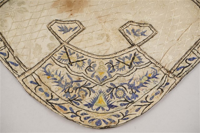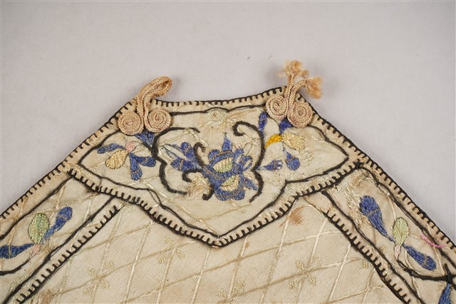 本物件為米白底彩繡花卉紋菱形肚兜,圍頸部分裁平,正反面為米白色棉布,正面布料鑲有金色格菱紋,可見鎖邊繡、緞面繡等技法,四邊緄邊為梳齒紋及花卉紋,圍腹部分則為菊花紋、纏枝花卉,並繡有蜈蚣及犀角。圍腹上方菱形則有緞面繡之花蕾圖案。犀角為民間八寶之一,蜈蚣則為五毒之首,能嚇阻其他毒物,有避邪之作用。