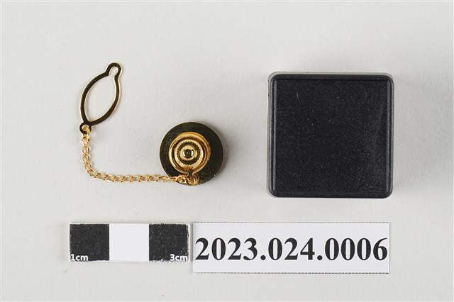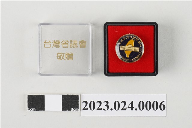 此為臺灣省議會紀念之金屬烤漆徽章,所見徽章作黑底金紋,中央飾有臺灣省議會大樓徽,周圍環繞中英文「中華民國臺灣省議會」字樣。並附正方形塑膠盒,盒蓋印有金字「臺灣省議會敬贈」。臺灣省議會原於1946年「臺灣省參議會」(原址於今臺北市南海路),為臺灣最高民意機構,後於1951年廢止,設「臺灣省臨時省議會」(1958年遷址臺中霧峰),1959年改為臺灣省議會。1998年省議會廢除後,原址設「臺灣省議會紀念園區」,省政代議制度亦正式走入歷史。