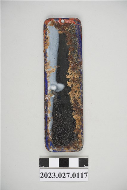 為溪湖信用購買販賣利用組合員鐵片,鐵片為長方形,藍色為底,上方有白字「保證責任溪湖信用購買販賣利用組合員」與該組合紅白徽章「同榮共存」。該鐵片內容清晰,但周圍皆有生鏽破損痕跡。