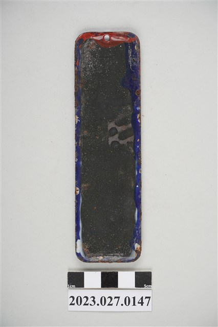 為溪湖信用購買販賣利用組合員鐵片,鐵片為長方形,藍色為底,上方有白字「保證責任溪湖信用購買販賣利用組合員」與該組合紅白徽章「同榮共存」。該鐵片內容清晰,但周圍皆有生鏽破損痕跡。