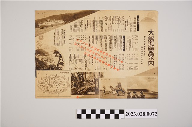 本物件為下田旅遊手冊,為1長方形紙張對折頁,共兩面,左邊寫有「御神火の大島お吉の下田」及發行單位為東京灣汽船,封面上有2名身著花色和服之女子,笑容可掬揮手,旁邊則寫有下田旅遊指引,包含名勝古蹟以及附近溫泉,另一面則寫有大島遊覽說明。