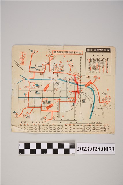 本物件為京都旅遊手冊,為1長方形紙張對折頁,共兩面,左邊寫有「京都名所遊覽パス營業案內」及發行單位為京都名所遊覽乘合自動車株式會社,封面為遊覽巴士及京都古塔,旁邊則寫有下遊覽巴士的特色,另一面則繪有京都旅遊路線圖,並將京都景點標出。