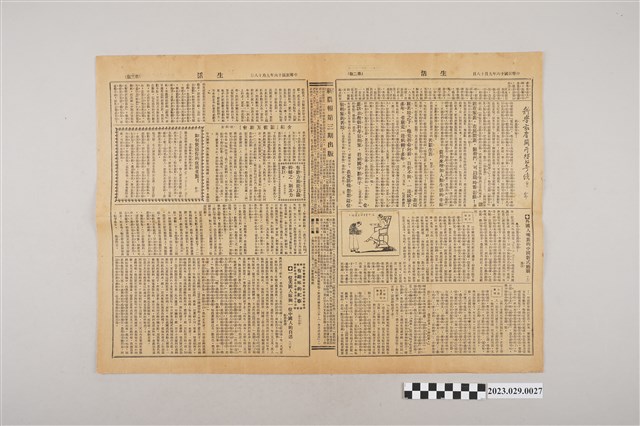 1.本物件為中華職業教育社發行《生活》第二卷第四十六期,正面寫有「本期目次」記載當期文章題名,正面寫有「文明家庭的夫人究竟要做什麼事?」、前塵影事專欄「風雅之士大不風雅」等文章;背面為文章與廣告,寫有讀者通訊專欄「不快」,並刊登光藝照相館、工商銀行、商務印書館等商家廣告;翻開內頁為文章,文章包含「科學家奮鬪所得的奇績(下)」、「如何使得你的皮膚美麗?」、「外國人嘴裏的中國新式婚姻(上)」等。2.《生活》發行時間自民國14年(1925)10月11日至民國22年(1933),旨以用生動的文字、趣味的題材來暗示人生修養,民國15年(1926)10月鄒韜奮接手主編後,開始宣傳抗日思想。
