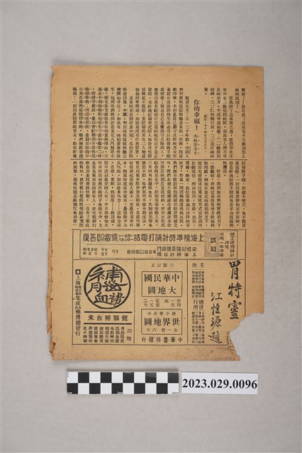 1.本物件為中華職業教育社編輯《生活》散頁,為《生活》散頁,正面為連載小說「一個女子戀愛的時候(三十八)」及自由農場廣告,背面為文章「你的幸福!」及上海計時公司、中華書局等商家廣告;翻開內頁為文章與廣告,文章包含「編後隨筆」、「讀者信箱」,廣告則包含上海鴻興襪廠、靈生公司等商家廣告。2.《生活》發行時間自民國14年(1925)10月11日至民國22年(1933),旨以用生動的文字、趣味的題材來暗示人生修養,民國15年(1926)10月鄒韜奮接手主編後,開始宣傳抗日思想。
