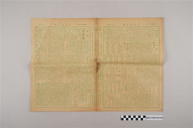 1.本物件為三六九小報社發行《三六九小報》第十四號,發行人為趙雅福,正面和光醫院、太陽自動車商會、陳宗能醫院等8個廣告;背面為雜爼專欄「幸盦隨筆」、花選喜劇等內容;翻開內頁有史遺專欄「謙遜失言(二)」、新書介紹、說海專欄有長篇小說「蝶夢痕」等文章,左下角「一個毛斷女的裡影」為橫式排版。2.《三六九小報》發行時間自昭和5年(1930)至昭和10年(1935),旨以刊登戲謔、針砭時事之文,反映當時的社會狀況。