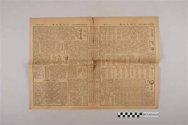 1.本物件為三六九小報社發行《三六九小報》第十九號,發行人為趙雅福,正面為和光醫院、財源商會自動車部、永茂商行等6個廣告;背面為雜爼專欄「荒唐齋小話」,花叢小記有一女子的照片;翻開內頁有史遺專欄「文藝冠者(三)」、新聊齋,說海專欄有長篇小說「蝶夢痕」、左下角有橫式排版的「上帝所賜的! 心所願!?」等文章。2.《三六九小報》發行時間自昭和5年(1930)至昭和10年(1935),旨以刊登戲謔、針砭時事之文,反映當時的社會狀況。