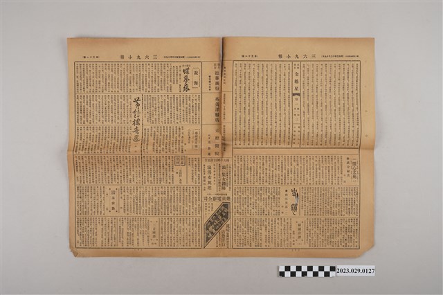 1.本物件為三六九小報社發行《三六九小報》第三十一號,發行人為趙雅福,正面為壽生醫院、上海眼鏡製造公司、嘉義蘭記圖書部等7個廣告;背面為雜爼專欄「荒唐齋小話」、三六九小報社社告等內容;翻開內頁有占據4分之1版面的明史說部「金魁星」,史遺專欄「鄉試笑話(一)」、說海專欄長篇小說「蝶夢痕」等文章,中間的版面刊登有5個廣告。2.《三六九小報》發行時間自昭和5年(1930)至昭和10年(1935),旨以刊登戲謔、針砭時事之文,反映當時的社會狀況。