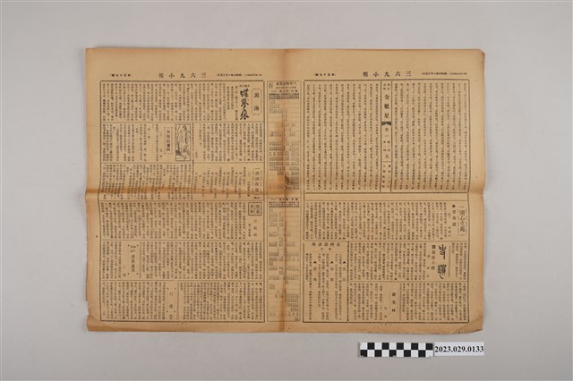 1.本物件為三六九小報社發行《三六九小報》第三十七號,發行人為趙雅福,正面為清井醫院、阿公店興產公司、興農商會等17個廣告;背面為雜爼專欄「幸盦隨筆」、新町行進曲等內容;翻開內頁有占據4分之1版面的明史說部「金魁星」,開心文苑「愛菊說」、說海專欄長篇小說「蝶夢痕」、諷世短篇「善於運用」等文章。2.《三六九小報》發行時間自昭和5年(1930)至昭和10年(1935),旨以刊登戲謔、針砭時事之文,反映當時的社會狀況。
