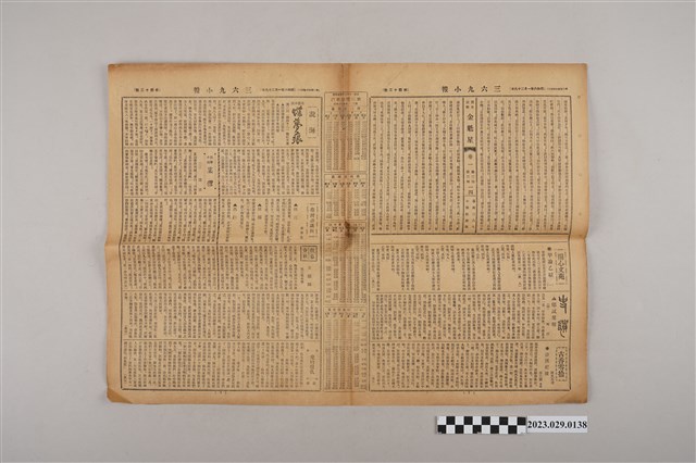 1.本物件為三六九小報社發行《三六九小報》第四十二號,發行人為趙雅福,正面為臺灣法律新報社、阿公店興產公司、和光醫院等10個廣告;背面為雜爼專欄「荒唐齋小話」、浪漫詩壇等內容;翻開內頁有占據4分之1版面的明史說部「金魁星」,開心文苑「甲論乙駁」、史遺專欄「鄉試果報(續)」,說海專欄則有長篇小說「蝶夢痕」、技擊小說「某僧(二)」等文章。2.《三六九小報》發行時間自昭和5年(1930)至昭和10年(1935),旨以刊登戲謔、針砭時事之文,反映當時的社會狀況。