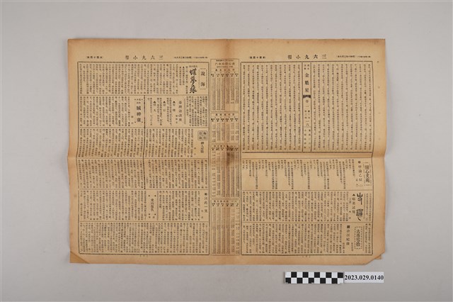 1.本物件為三六九小報社發行《三六九小報》第四十四號,發行人為趙雅福,正面為長壽齒科醫院、漢醫眼科醫院、林廷棟醫院等11個廣告;背面為雜爼專欄「幸盦隨筆」等內容,花叢小記有一女子的照片;翻開內頁有占據4分之1版面的明史說部「金魁星」,開心文苑「甲論乙駁(二)」、說海專欄長篇小說「蝶夢痕」、諷世小說「賊神童」等文章。2.《三六九小報》發行時間自昭和5年(1930)至昭和10年(1935),旨以刊登戲謔、針砭時事之文,反映當時的社會狀況。