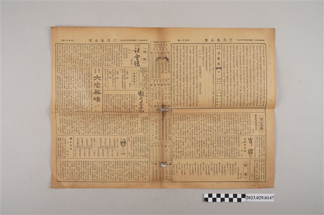 1.本物件為三六九小報社發行《三六九小報》第五十一號,發行人為趙雅福,正面為長壽齒科醫院、蘭記書局、太原醫院等9個廣告;背面為雜爼專欄「各國接吻小史(五)」、詩壇等內容;翻開內頁有明史說部「金魁星」、史遺專欄「嚴辨末路(六)」,說海專欄社會小說「社會鏡(三)」、現代長篇「大陸英雄(四)」等文章。2.《三六九小報》發行時間自昭和5年(1930)至昭和10年(1935),旨以刊登戲謔、針砭時事之文,反映當時的社會狀況。