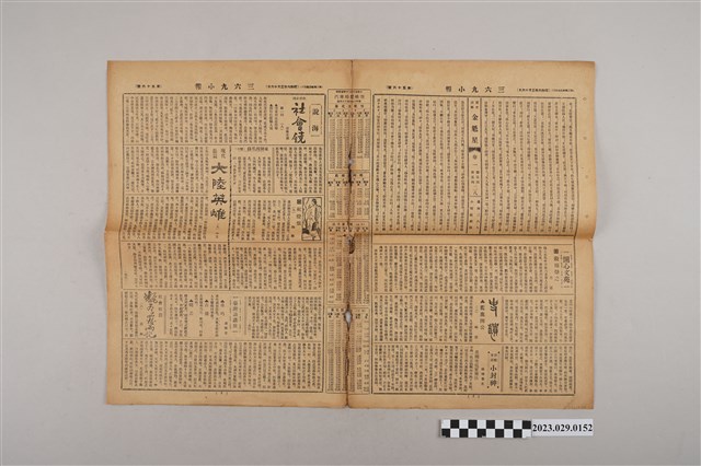 1.本物件為三六九小報社發行《三六九小報》第五十六號,發行人為趙雅福,正面為阿公店興產公司、蘭記書局、興農商會等9個廣告;背面為雜爼專欄「荒唐齋小話」、「花花絮絮錄」等內容;翻開內頁有明史說部「金魁星」、開心文苑「殺而祭之」、滑稽童話「小封神」,說海專欄社會小說「社會鏡第一回(八)」、現代長篇「大陸英雄(九)」等文章。2.《三六九小報》發行時間自昭和5年(1930)至昭和10年(1935),旨以刊登戲謔、針砭時事之文,反映當時的社會狀況。