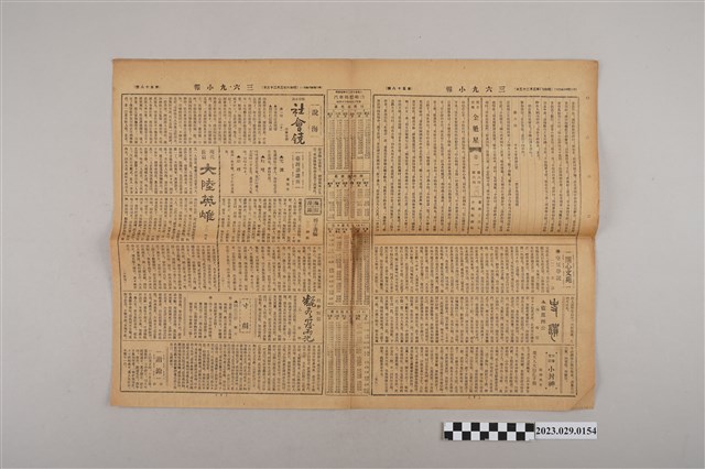 1.本物件為三六九小報社發行《三六九小報》第五十八號,發行人為趙雅福,正面為長壽齒科醫院、蘭記書局、吉豊洋行等9個廣告;背面為雜爼專欄「花花絮絮錄」、花叢小記等內容;翻開內頁有明史說部「金魁星」、開心文苑「空氣學說(一)」、說海專欄社會小說「社會鏡第一回(十)」、現代長篇「大陸英雄(十一)」等文章。