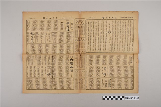 1.本物件為三六九小報社發行《三六九小報》第六十三號,發行人為趙雅福,正面為伊達新三郎商店臺南支店、新吉川履物部景品係、永茂商行等10個廣告;背面為雜爼專欄「荒唐齋小話」、哭庵說笑「牙齒拔齒」;翻開內頁有明史說部「金魁星」、開心文苑「徵求折相好之善策」,說海專欄社會小說「社會鏡第二回(十五)」、現代長篇「大陸英雄(十六)」等文章。2.《三六九小報》發行時間自昭和5年(1930)至昭和10年(1935),旨以刊登戲謔、針砭時事之文,反映當時的社會狀況。