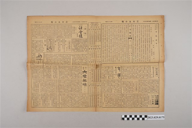 1.本物件為三六九小報社發行《三六九小報》第七十九號,發行人為趙雅福,正面為漢醫眼科醫院、祥禎堂時計店、興農商會等9個廣告;雜爼專欄「芳圃閒話」、蒲溪雜拾「兩個近眼」等內容;翻開內頁有明史說部「金魁星」、史遺專欄「試場笑話(四)」,說海專欄社會小說「社會鏡第三回(三一)」、現代長篇「大陸英雄(三二)」等文章。2.《三六九小報》發行時間自昭和5年(1930)至昭和10年(1935),旨以刊登戲謔、針砭時事之文,反映當時的社會狀況。
