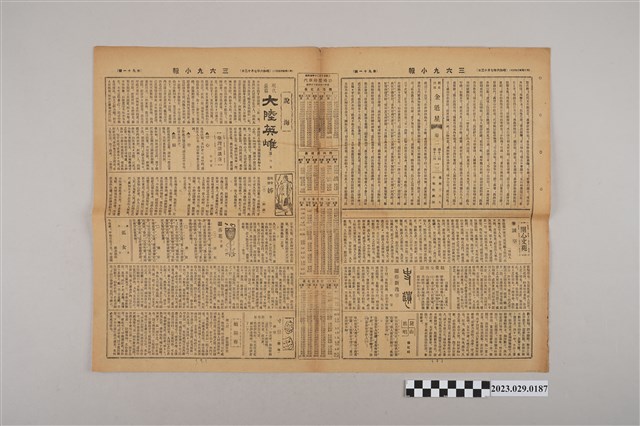 1.本物件為三六九小報社發行《三六九小報》第九十一號,發行人為趙雅福,正面為清水齒科醫院、蘭記書局、採芳線香商店等7個廣告;雜爼專欄「幸盦隨筆」、陋室諧談等內容;翻開內頁有明史說部「金魁星」、開心文苑「談空」,說海專欄現代長篇「大陸英雄(四四)」、社會悲情「姊(一八)」、狐女等文章。2.《三六九小報》發行時間自昭和5年(1930)至昭和10年(1935),旨以刊登戲謔、針砭時事之文,反映當時的社會狀況。