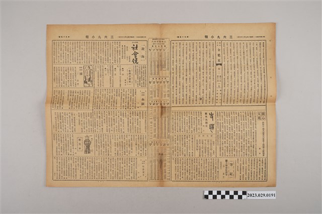 1.本物件為三六九小報社發行《三六九小報》第九十五號,發行人為趙雅福,正面為清水齒科醫院、蘭記圖書局、採芳線香商店等7個廣告;雜爼專欄「幸盦隨筆」、蒲溪雜拾等內容;翻開內頁有明史說部「金魁星」、史遺專欄「風流艷史(二)」,說海專欄社會小說「社會鏡第五回(四五)」、哀情短篇「血淚」等文章。2.《三六九小報》發行時間自昭和5年(1930)至昭和10年(1935),旨以刊登戲謔、針砭時事之文,反映當時的社會狀況。