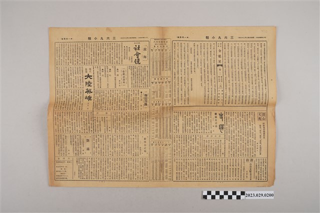 1.本物件為三六九小報社發行《三六九小報》第一百四號,發行人為趙雅福,正面為阿公店興產公司、蘭記圖書局、吉豊洋行等7個廣告;雜爼專欄「冷紅室隨筆(三)」、醉夢齋消閒錄「兒勿多言」等內容;翻開內頁有明史說部「金魁星」、史遺專欄「蘭棗道臺(二)」,說海專欄社會小說「社會鏡第五回(五四)」、現代長篇「大陸英雄(五六)」等文章。2.《三六九小報》發行時間自昭和5年(1930)至昭和10年(1935),旨以刊登戲謔、針砭時事之文,反映當時的社會狀況。