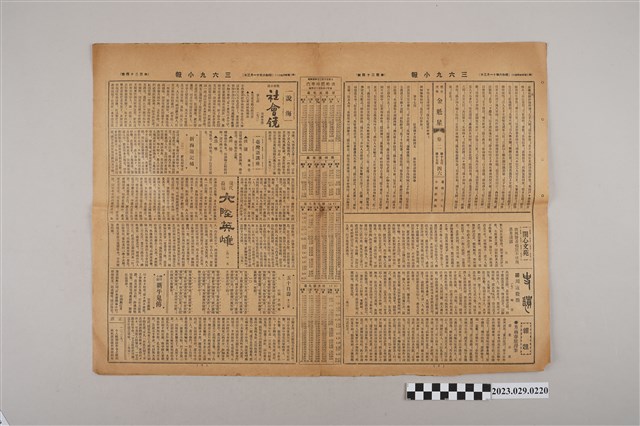1.本物件為三六九小報社所發行《三六九小報》第百二十四號,發行人為趙雅福,報紙正面刊登清水齒科醫院、採芳線香商店、蘭記書局及大山洋服店等廣告,背面為雜爼專欄、詩壇專欄以及花叢小記等文章,翻開內頁則為社會鏡、大陸英雄、金魁星等若干長篇連載,內頁中間印有汽車時刻表。2.《三六九小報》發行時間至昭和5年 (1930)至昭和10年 (1935)。旨以刊登戲謔、針貶時事之文,反映當時的社會狀況。