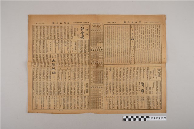 1.本物件為三六九小報社所發行《三六九小報》第百二十六號,發行人為趙雅福,報紙正面刊登伯壎齒科醫院、永茂商行及蘭記書局等廣告,背面為雜爼專欄、詩壇專欄以及花叢小記等文章,翻開內頁則為社會鏡、大陸英雄、金魁星等若干長篇連載,內頁中間印有汽車時刻表。2.《三六九小報》發行時間至昭和5年 (1930)至昭和10年 (1935)。旨以刊登戲謔、針貶時事之文,反映當時的社會狀況。