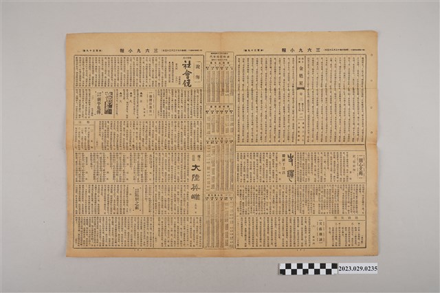 1.本物件為三六九小報社所發行《三六九小報》第百三十九號,發行人為趙雅福,報紙正面刊登伯壎齒科醫院、振益商店及永安公司等廣告,背面為雜爼專欄、詩壇專欄以及花叢小記等文章,翻開內頁則為社會鏡、大陸英雄、金魁星等若干長篇連載,內頁中間印有汽車時刻表。2.《三六九小報》發行時間至昭和5年 (1930)至昭和10年 (1935)。旨以刊登戲謔、針貶時事之文,反映當時的社會狀況。