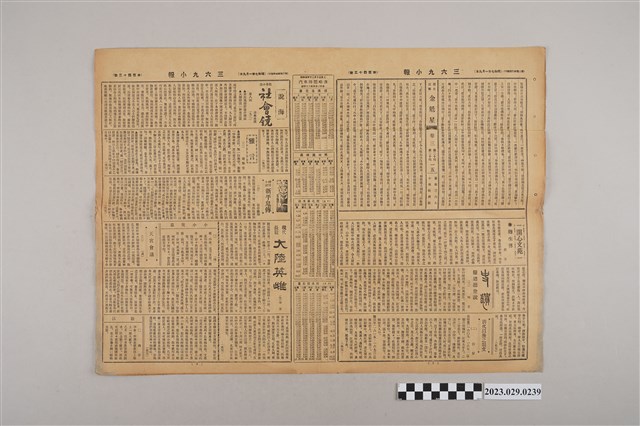 1.本物件為三六九小報社所發行《三六九小報》第百四十三號,發行人為趙雅福,報紙正面刊登醫院伯壎齒科醫院、辰馬商行及永安公司等廣告,背面為雜爼專欄、花叢小記以及新年竹枝詞等文章,翻開內頁則為社會鏡、大陸英雄、金魁星等若干長篇連載,內頁中間印有汽車時刻表。2.《三六九小報》發行時間至昭和5年 (1930)至昭和10年 (1935)。旨以刊登戲謔、針貶時事之文,反映當時的社會狀況。