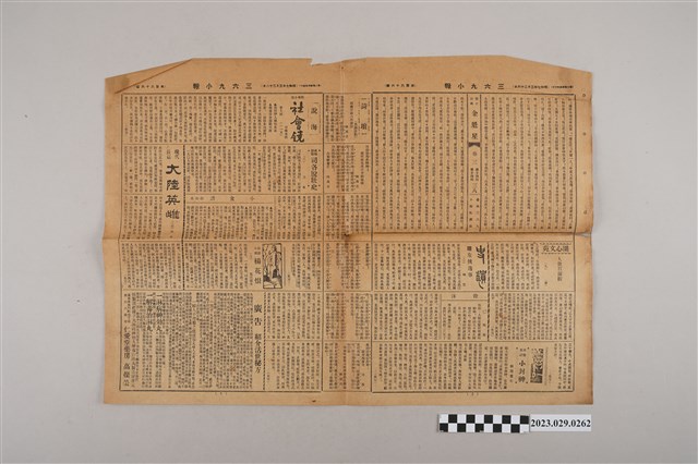 1.本物件為三六九小報社所發行《三六九小報》第百六十六號,發行人為趙雅福,報紙正面刊登伯壎齒科醫院、辰馬商行、和光醫院及日用百科奇書等廣告,背面為雜爼專欄、雅言專欄、花叢小記等文章,翻開內頁則為社會鏡、大陸英雄金魁星等若干長篇連載,內頁中間為詩壇專欄左下為廣告欄位。2.《三六九小報》發行時間至昭和5年 (1930)至昭和10年 (1935)。旨以刊登戲謔、針貶時事之文,反映當時的社會狀況。