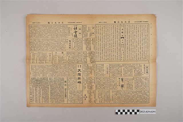1.本物件為三六九小報社發行《三六九小報》第百九十五號,正面為廣告,有南陽堂藥房、逢安理學治療所、蘭記書局、永森記材木商行、永森記製材工塲、山本齒科醫院等單位;背面寫有雜爼專欄「芳圃閒話」、「雅言」、「春痕秋夢錄」、「紫紅閣塵談」等文章,左下花叢小記有一名女子照片;翻開內頁有「金魁星」、開心文苑專欄「火頭軍沿革史」、「人世百面觀」、社會小說「社會鏡」、「鞠譜遺稿 (七)」、「無緣的小孩子」、現代長篇「大陸英雌」等文章。2.《三六九小報》發行時間自昭和5年 (1930)至昭和10年 (1935),旨以刊登